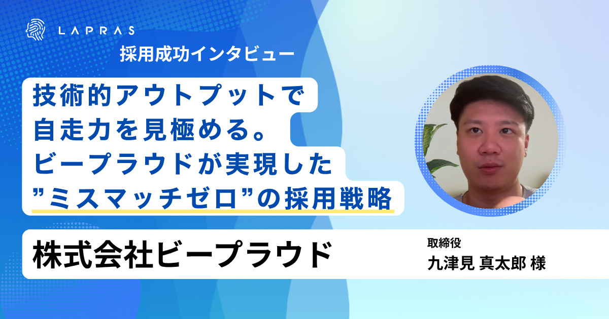 技術イベント登壇や自然流入を通じて、多くの優秀なエンジニアと出会ってきたビープラウド。そんな同社が新たに注目したのが、LAPRASを活用した技術的アウトプットに基づく採用です。自走力や課題解決力をより早い段階で見極めることで、理想の人材との出会いを着実に実現していく採用戦略について、同社の取締役であり、エンジニア採用をリードする九津見さんからお話を伺いました。
