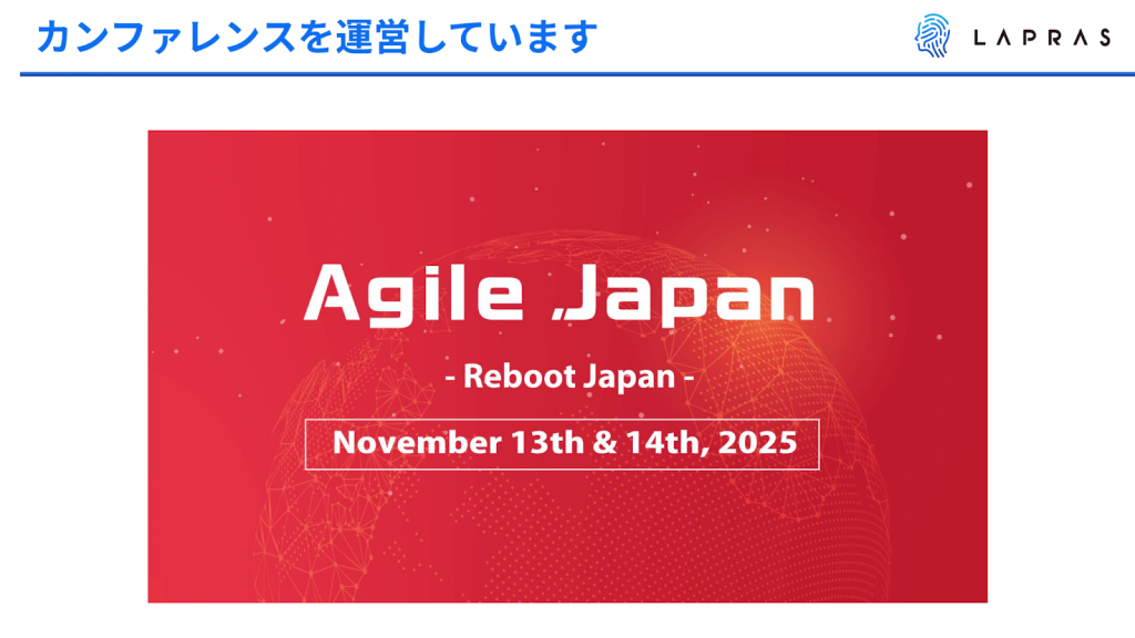 また、アジャイルのコミュニティは自分のグループが中心となって運営しています。社外の方に講演して貰ったり、一緒にイベントを企画したりすることもあります。例えば、JKさんに関わって貰って、Agile Japanのサテライトイベントを開催しました。