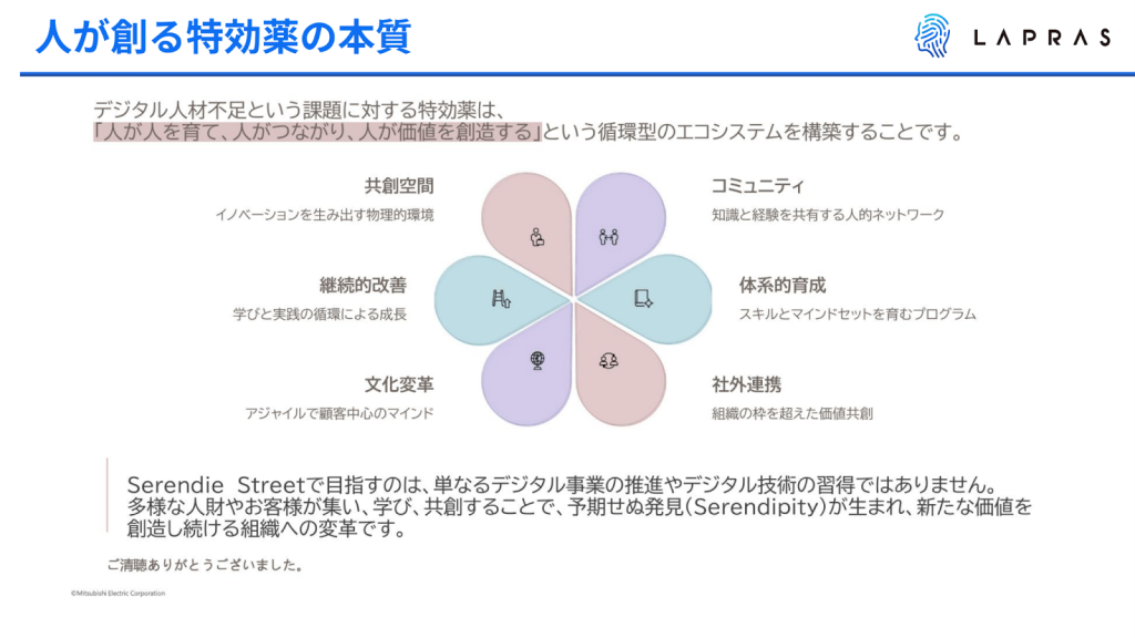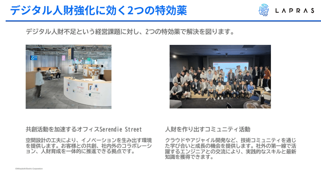 その中で今、弊社として二つの「特効薬」を掲げています。ひとつは、共創活動を加速する「Serendie Street」という実際の場づくり。もうひとつが、先ほども話に出ていた、人財を育てるコミュニティ活動です。この二つを大きな軸として取り組んでいます。