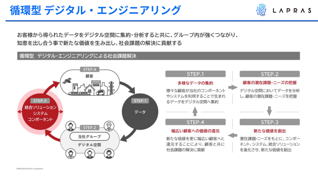 こちらは昨今弊社が掲げているのが、「循環型 デジタル・エンジニアリング」というものです。コンポーネントからさまざまなデータを取得し、そのデータをデジタル空間に集約・蓄積して分析し、新たなソリューションとして提供していく。その循環によってお客様の課題を発見し、社会課題の解決にもつなげていこう、という考え方です。