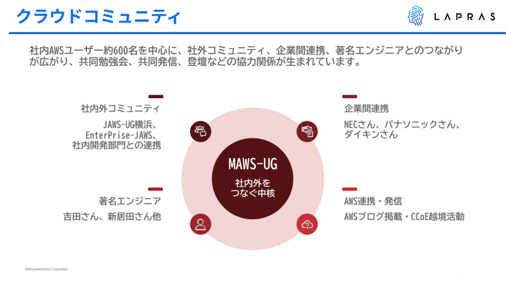 黒木さん:場づくりに加えて、コミュニティ活動にも力を入れています。クラウド関連とアジャイル関連、それぞれにコミュニティがありまして、例えばクラウド側では、AWSの日本ユーザグループである「JAWS-UG」の三菱版として、「MITSUBISHI の M」を取った「MAWS-UG」という名前のコミュニティがあります。いずれのコミュニティも、勉強会や情報交換の場として活用しています。