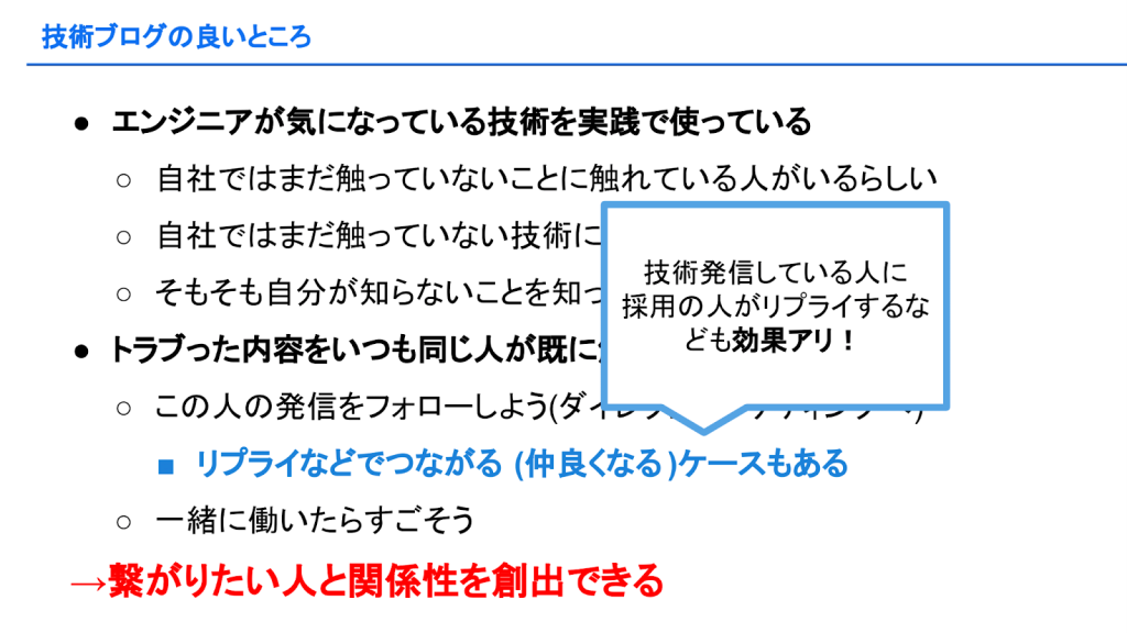 • 「つながるきっかけづくり」として技術ブログとSNSが重要