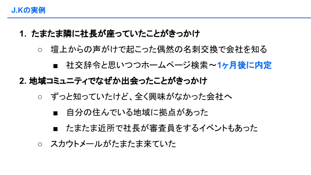 小坂さん:自分の実例を2つ紹介します。自分は2回転職しているのですが、1回目の転職は本日のようなイベントで「たまたま隣に前職の会社の社長が座っていた」というのがきっかけでした。