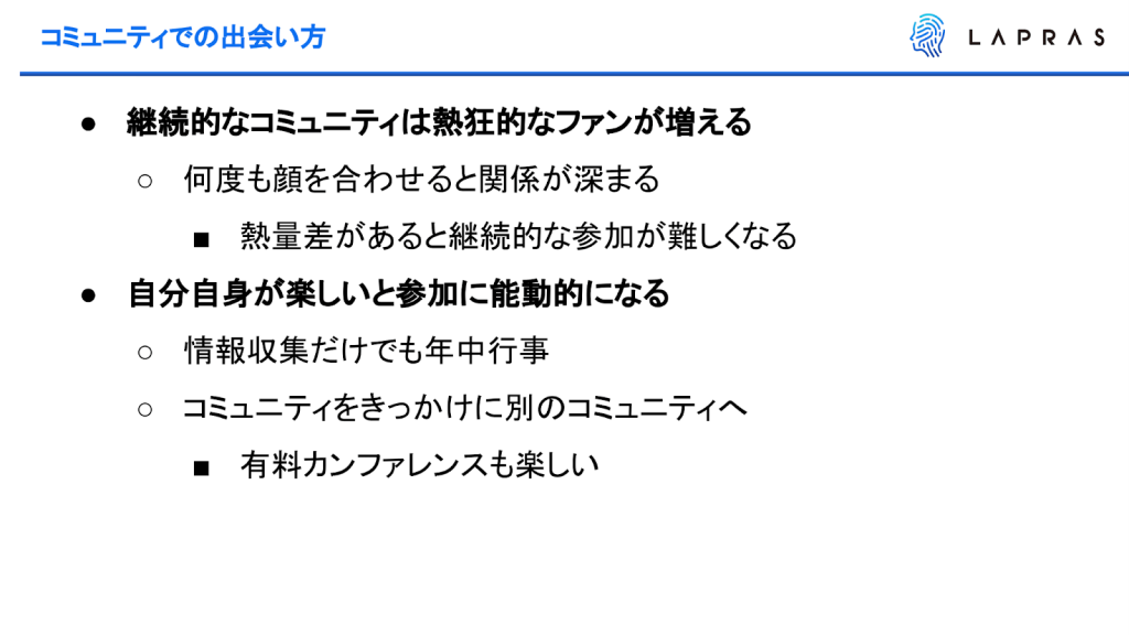小坂さん:コミュニティについて少し補足すると、弊社が関わっているAgile JapanやAI駆動開発勉強会のように、一度きりでなく継続して続いていくイベントもあります。そうしたイベントでは、同じ方と何度も顔を合わせて「また会いましたね」といったところから関係性が深まっていくことも多々あります。