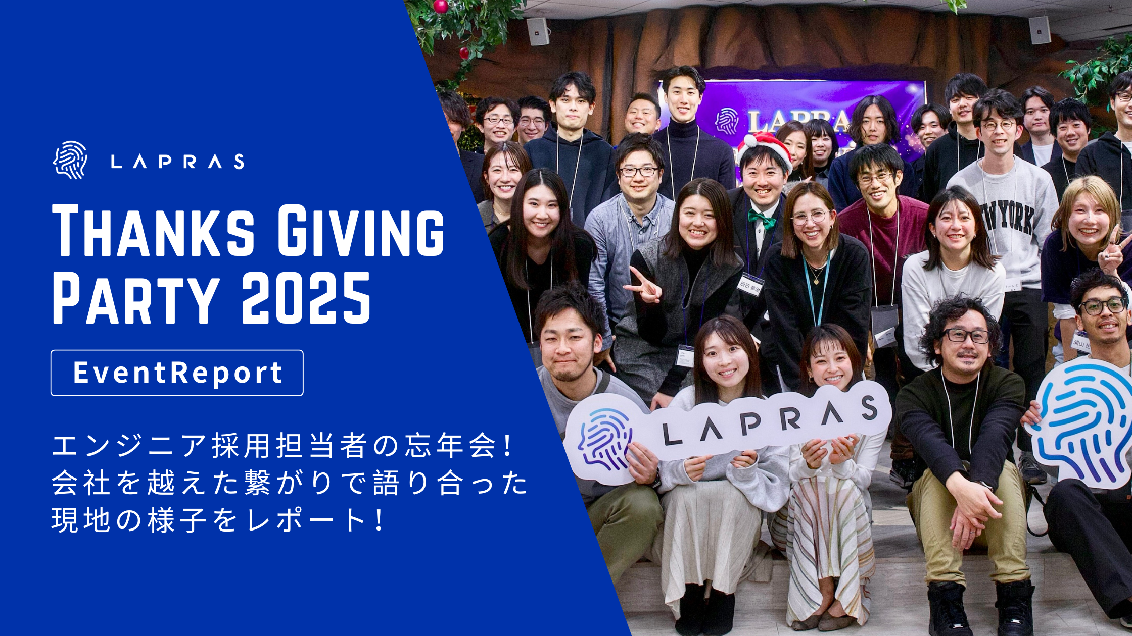 LAPRASでは、毎年 LAPRASの採用サービスをご活用いただいているクライアント企業さまをご招待し、エンジニア採用に関わるみなさまで「今年もお疲れさま!」と労いつつ、LAPRASからの感謝をお伝えする場として「LAPRAS Thanks Giving Party」を開催しています。