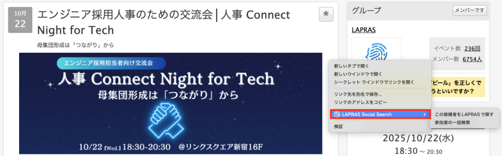 connpassでは、特定の技術領域をテーマにしたイベントが数多く開催されています。LAPRAS Social Searchを使えば、このconnpassのイベント参加者情報から、気になる方のLAPRASプロフィールを逆引きすることができます。探しているポジションに関連する過去のイベントを検索し、その参加者情報から候補者が見つけられます。