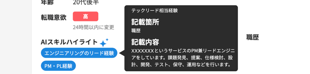 これは、AIが候補者の経歴からPM/PL、リード経験、EMなどのマネジメント経験を自動で判定し、可視化する機能です。