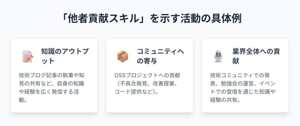 そこで鍵を握るのは、単純な開発技術力(ハードスキル)だけではなく、「他者貢献スキル」です。多くの場合、「他者貢献スキル」を持つITエンジニアの姿勢は、次のような活動として表れています。