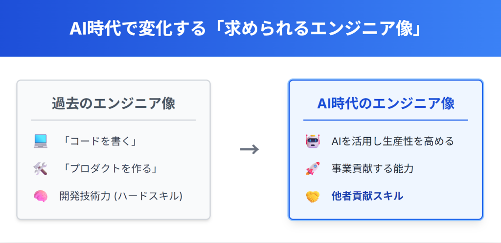お伝えしてきたように、今日のITエンジニアには、単なる技術力だけでなく、AIなどの最新技術を使いこなし、チームや事業の成長を牽引する「他者貢献/事業貢献」の姿勢が求められています。