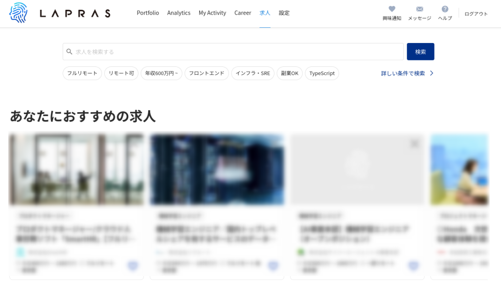 - LAPRASに登録されたユーザー情報や活動履歴を基に、一人ひとりにパーソナライズされた求人を一覧で表示する機能です。