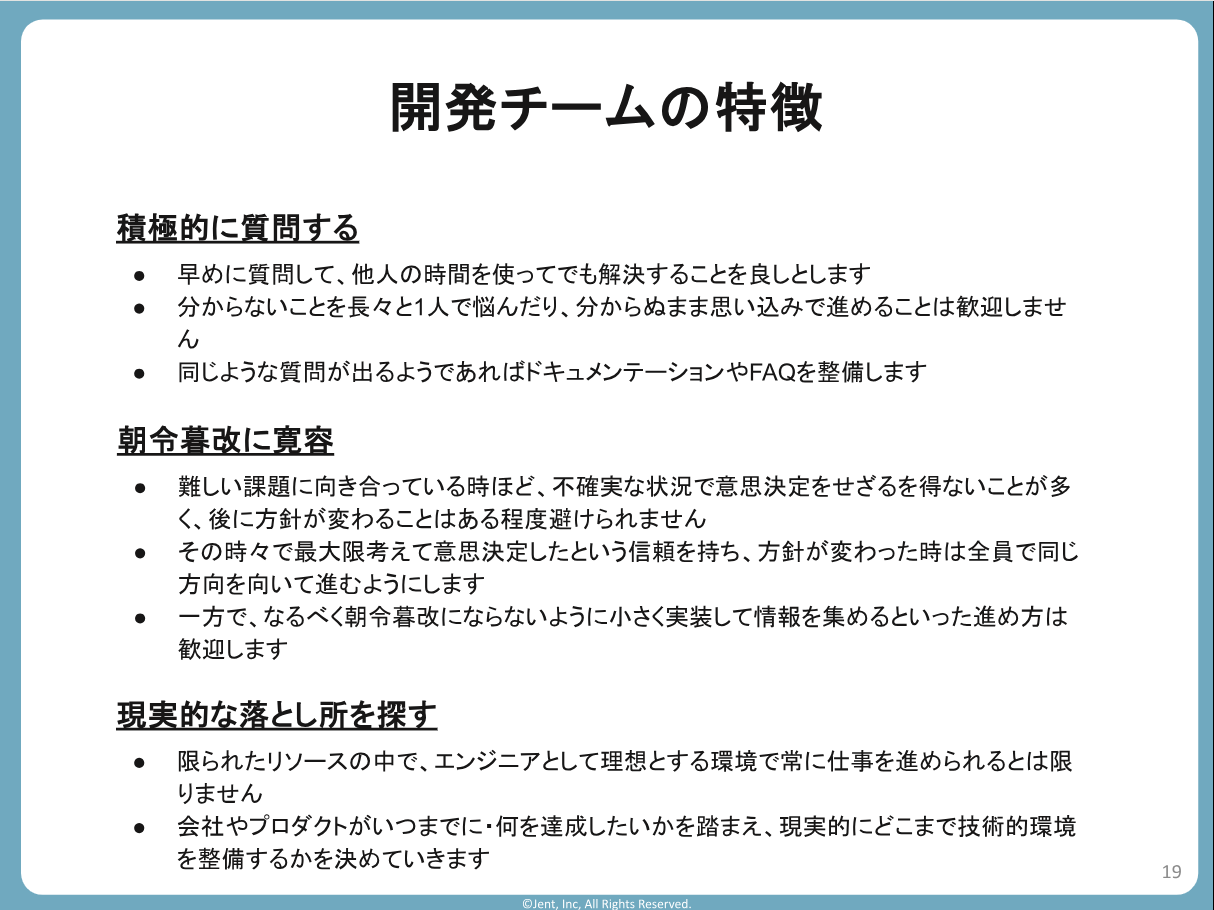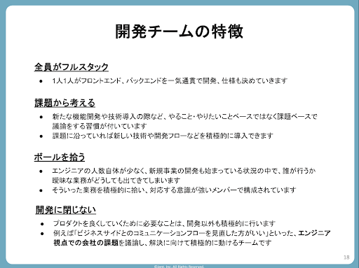 あとは、候補者に「チームの特徴」をきちんと伝えることも意識しています。面談では、前任者が言語化してくれた「開発チームとして大切にしている考え方」も紹介しています。たとえば、一人ひとりがフルスタックに関わることを前提に、課題から考える習慣や、役割にとらわれずボールを拾う姿勢、プロダクトを良くするために開発領域を越えて動く姿勢などです。