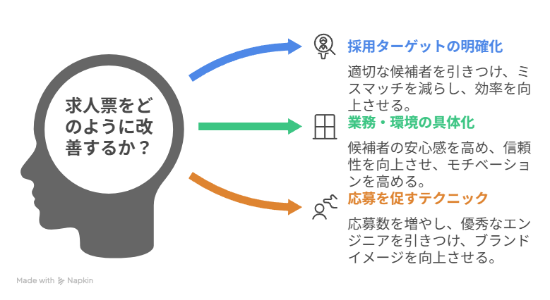 この記事では、優秀なエンジニアが求人票のどこを見て「ここで働きたい」と判断するのか、そのインサイトに基づいた7つの改善ポイントを解説しました。