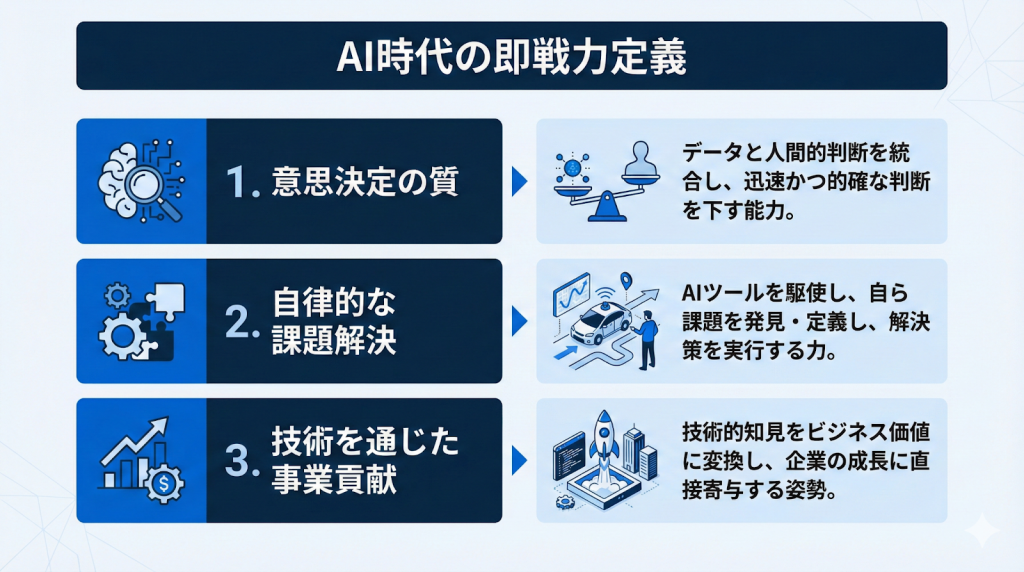 多くの企業が、単なる実装の作業者ではなく、技術を武器に事業を前進させられる「自律的なエンジニア」を即戦力として定義し、採用要件のアップデートに取り組んでいます。不確実な課題に対して自ら仮説を立て、技術を手段として自走できる力こそが、現代における真の「即戦力スキル」だと言えるでしょう。