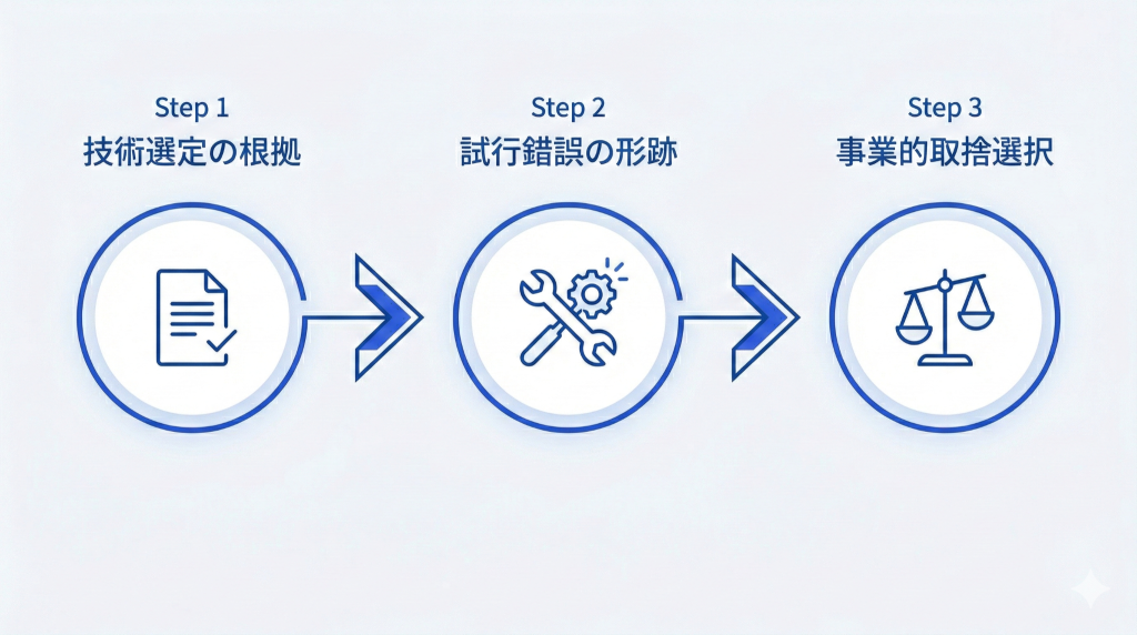 技術選定において、検討した代替案や比較軸についての記述があるかを確認します。「なぜその技術でなければならなかったのか」という根拠が明確か、どんな優先順位で最終的な決定に至ったのかといった経緯から、価値判断の基準を探ります。